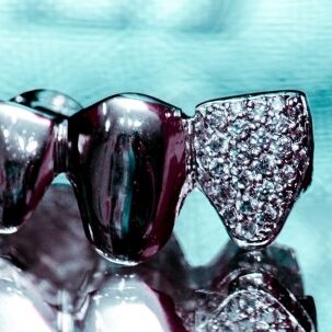 Grillz em prata 950 para três dentes superiores ou inferiores, com cravação de zircônia em um elemento.